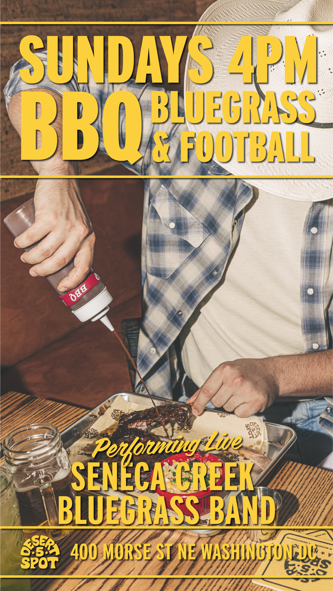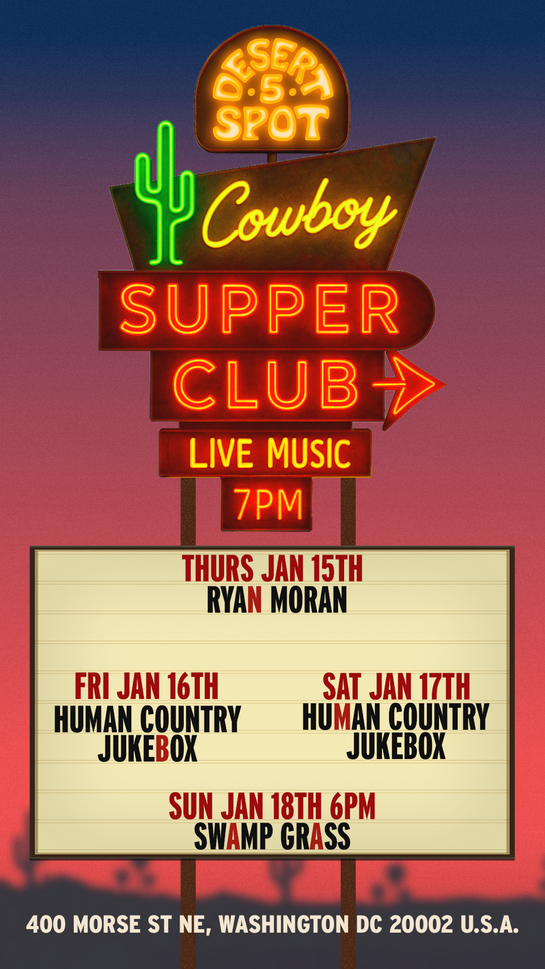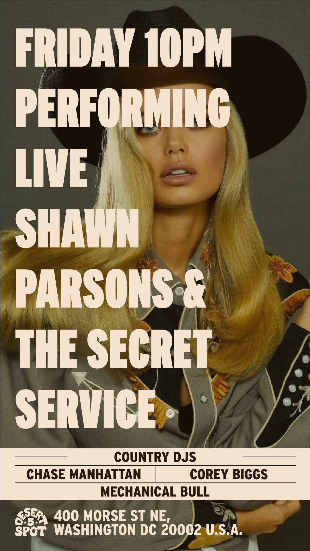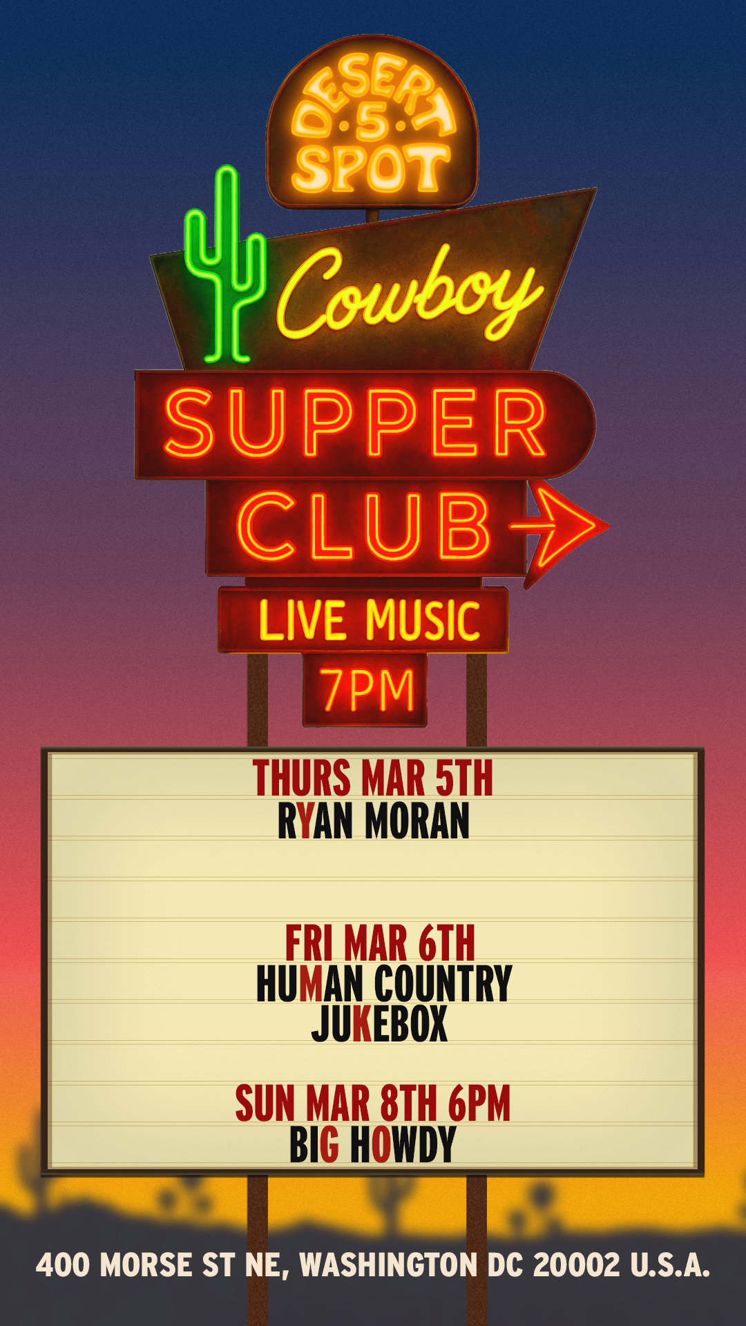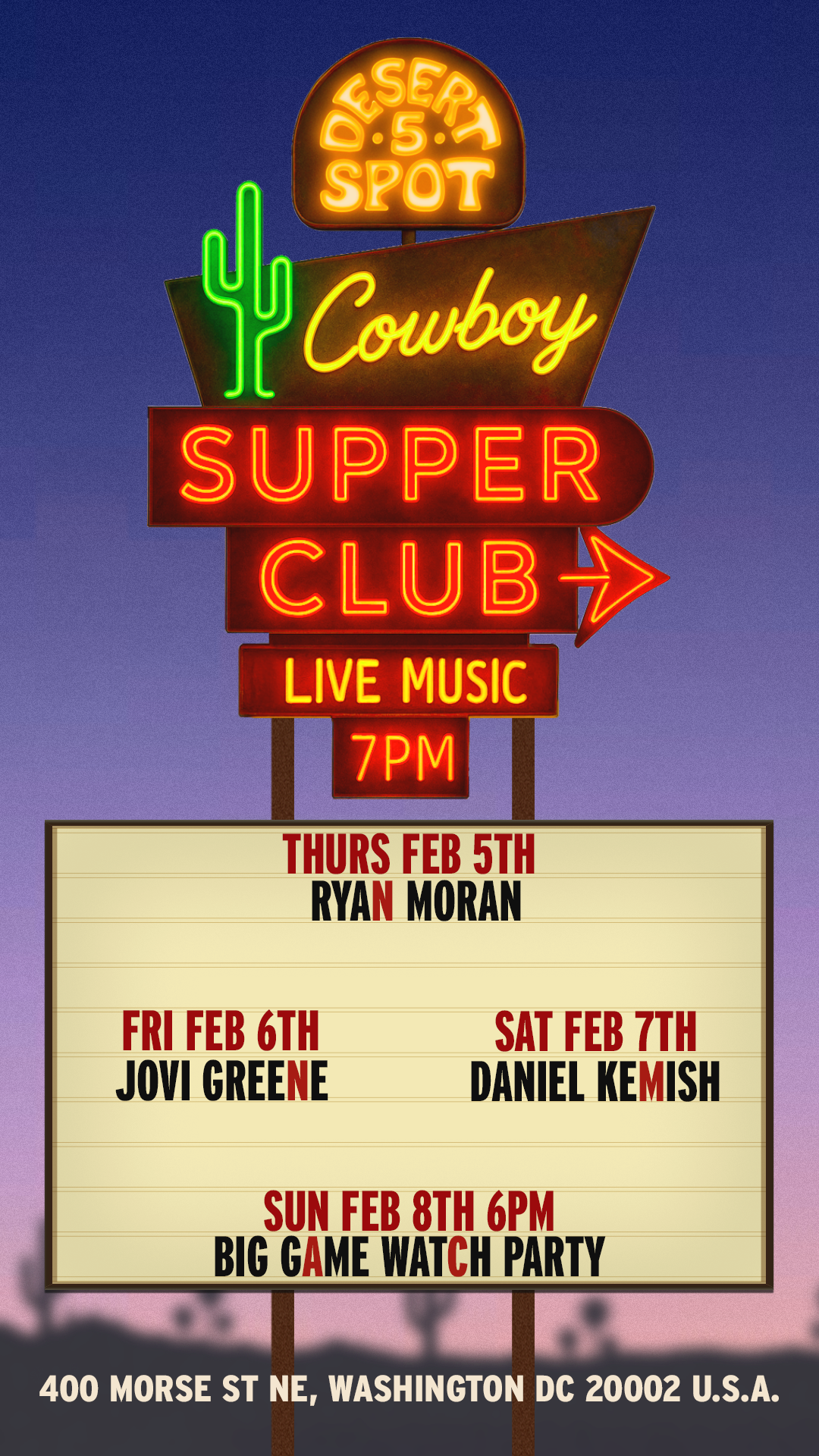 We kindly ask y'all to abide by the cowboy dress code at Desert 5 Spot. Cowboys Don't wear athletic shorts, athletic tops, sweatpants, or flip-flops.
