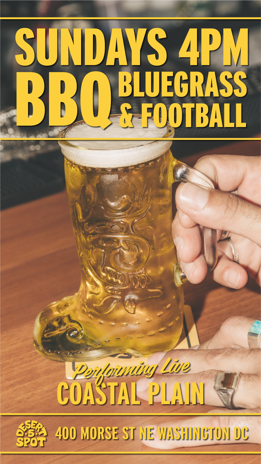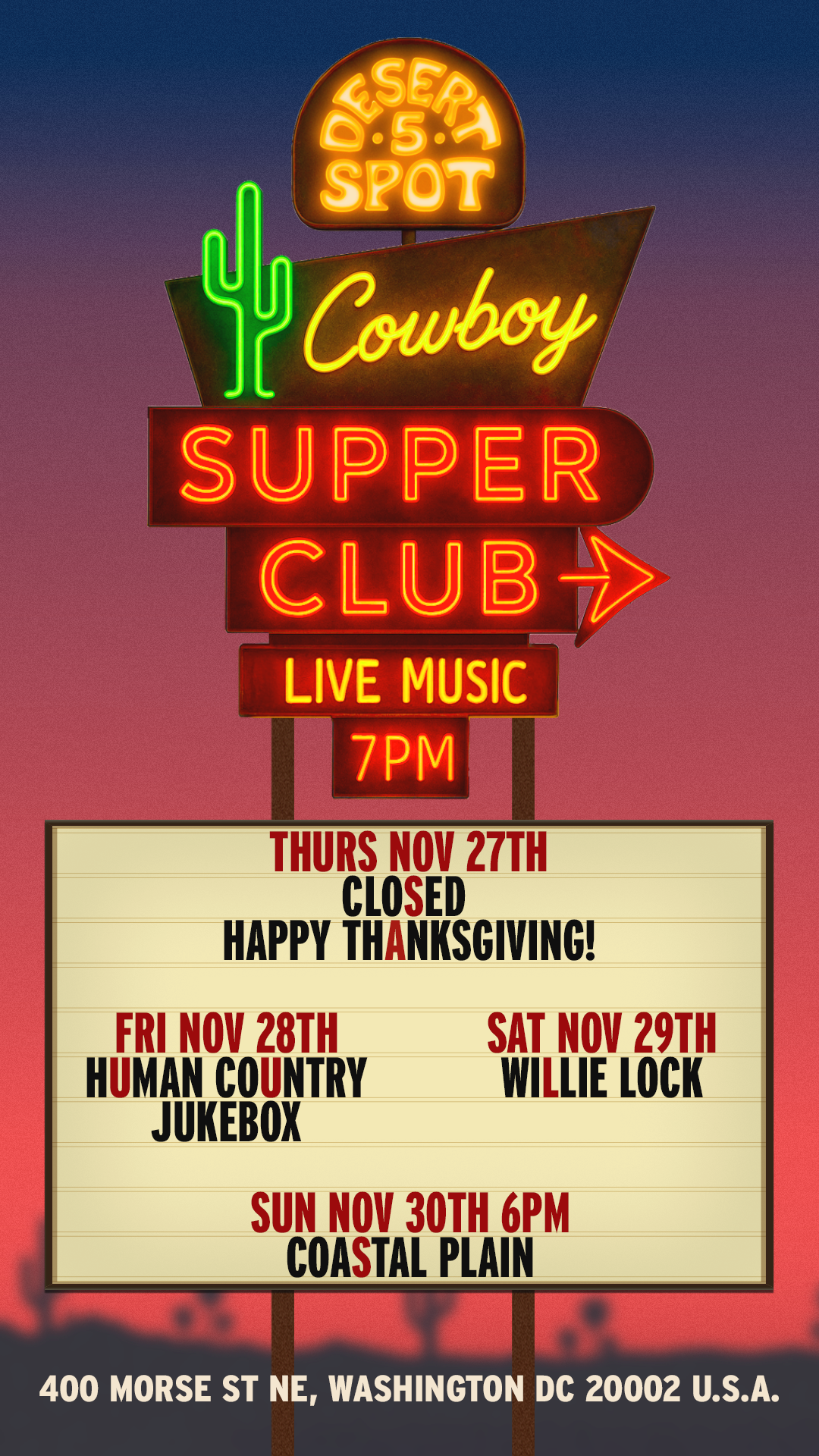 We kindly ask y'all to abide by the cowboy dress code at Desert 5 Spot. Cowboys Don't wear athletic shorts, athletic tops, sweatpants, or flip-flops.