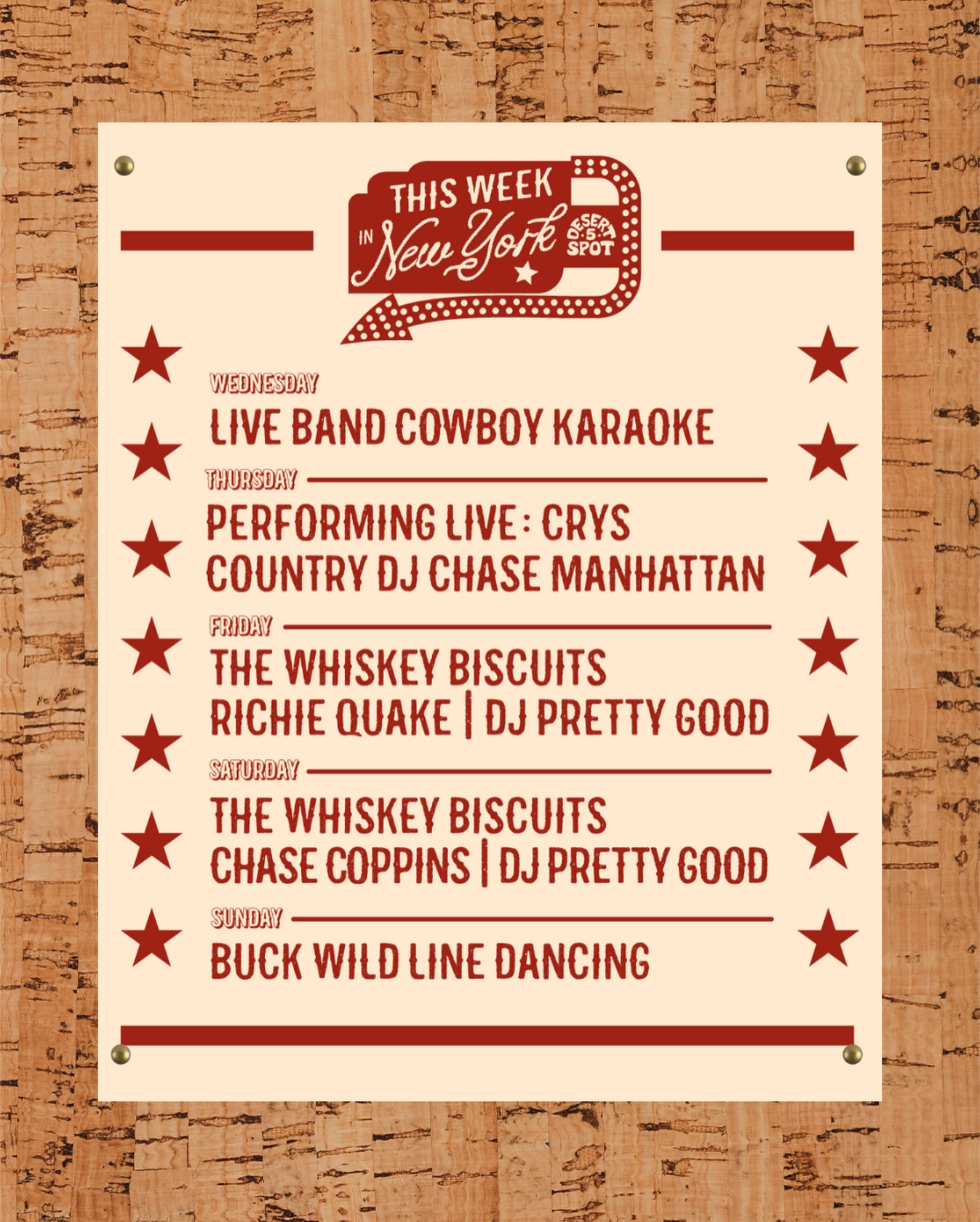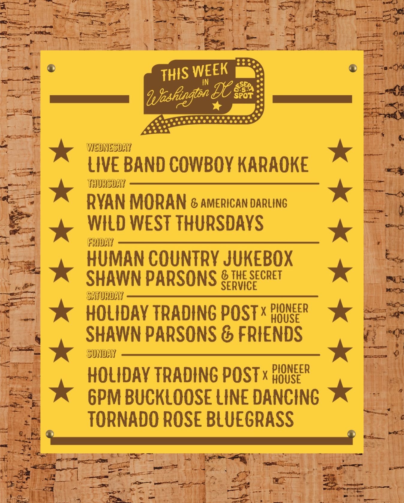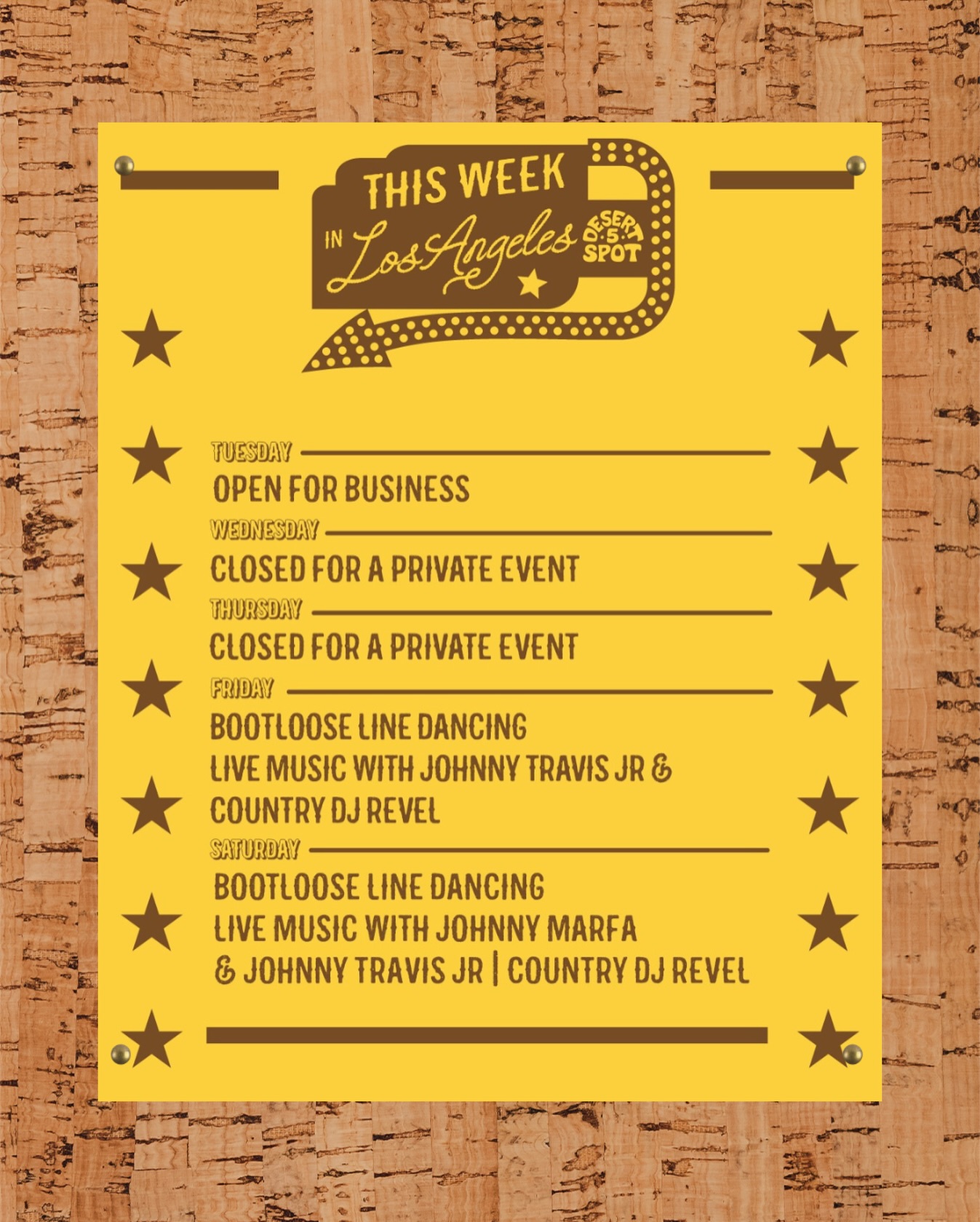 We kindly ask y'all to abide by the cowboy dress code at Desert 5 Spot. Cowboys Don't wear athletic shorts, athletic tops, sweatpants, or flip-flops.