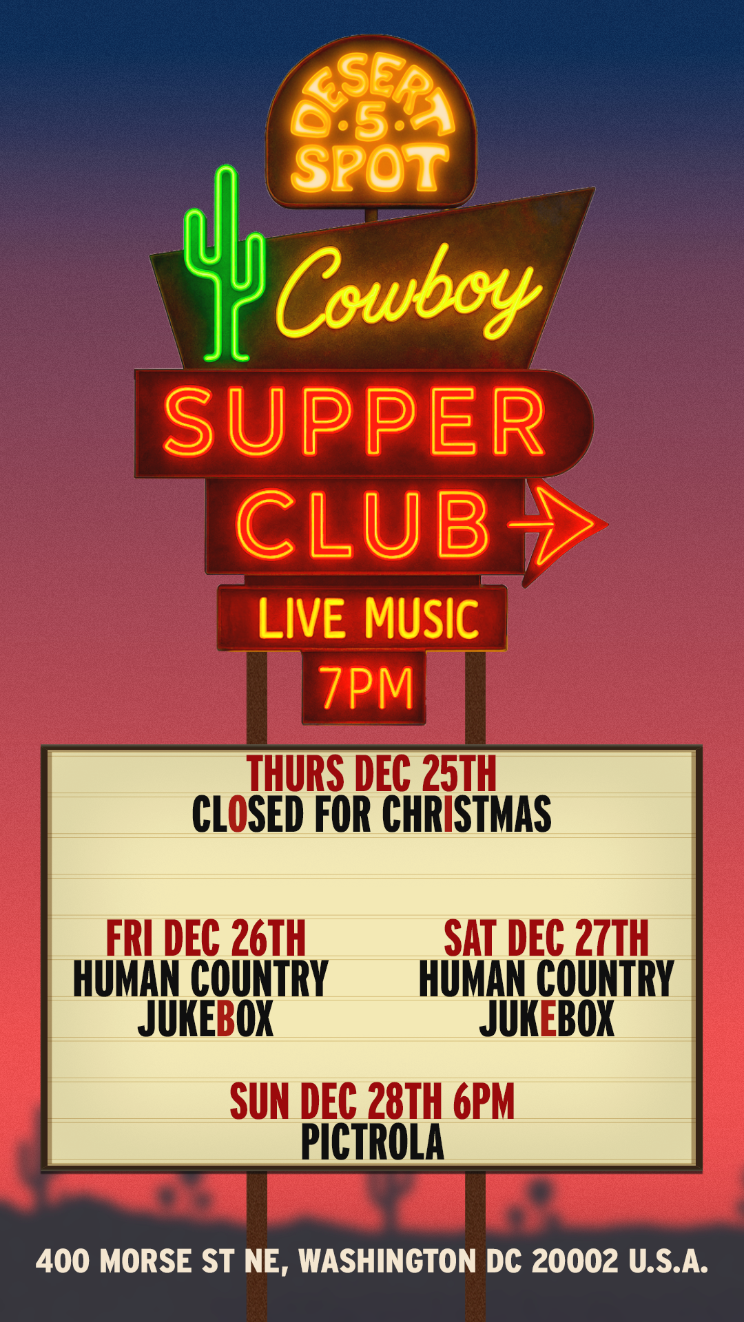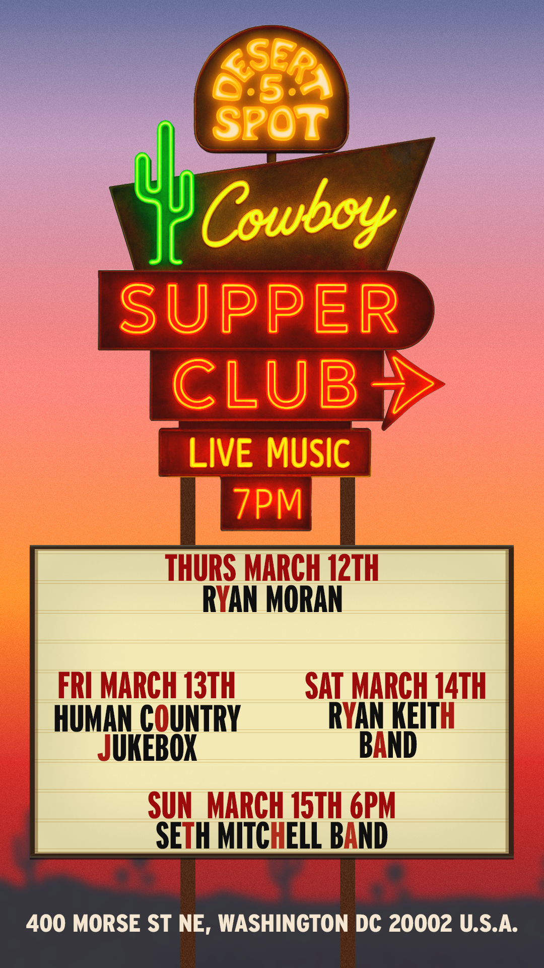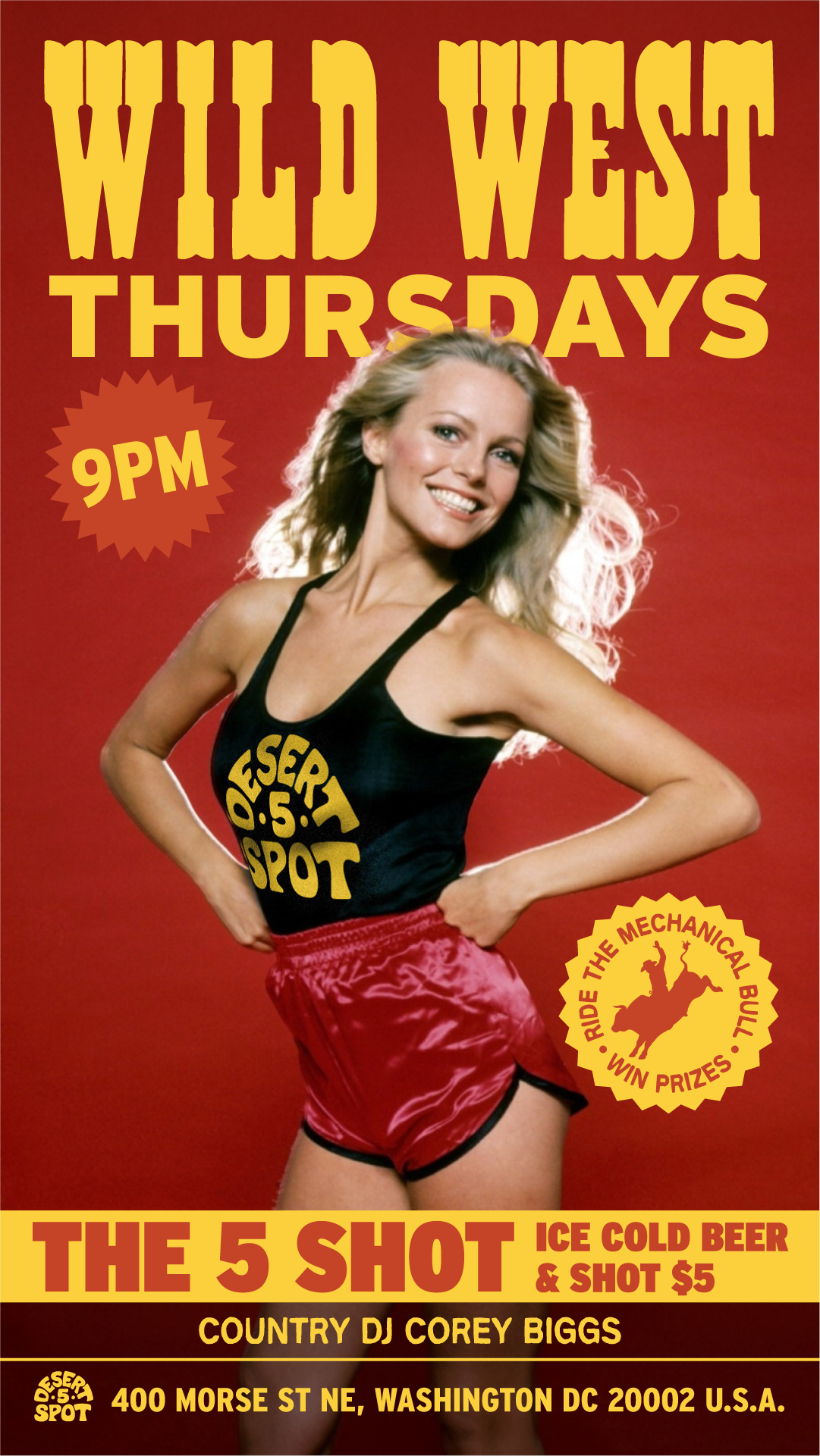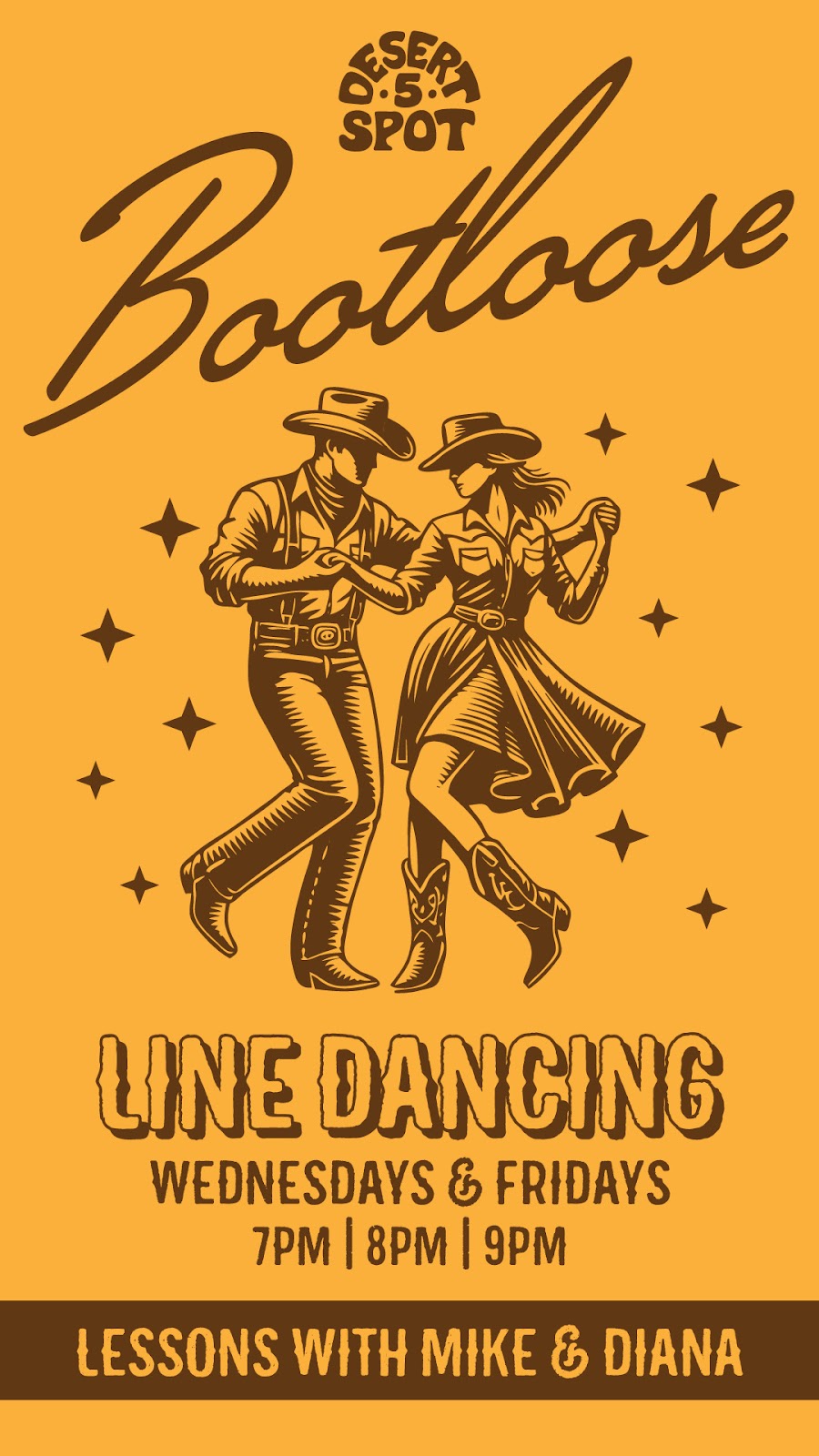 We kindly ask y'all to abide by the cowboy dress code at Desert 5 Spot. Cowboys Don't wear athletic shorts, athletic tops, sweatpants, or flip-flops.